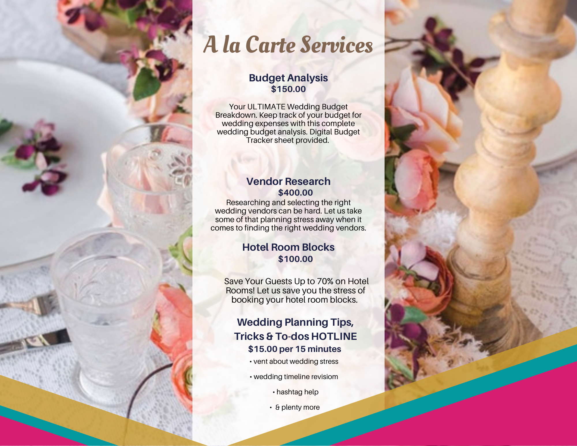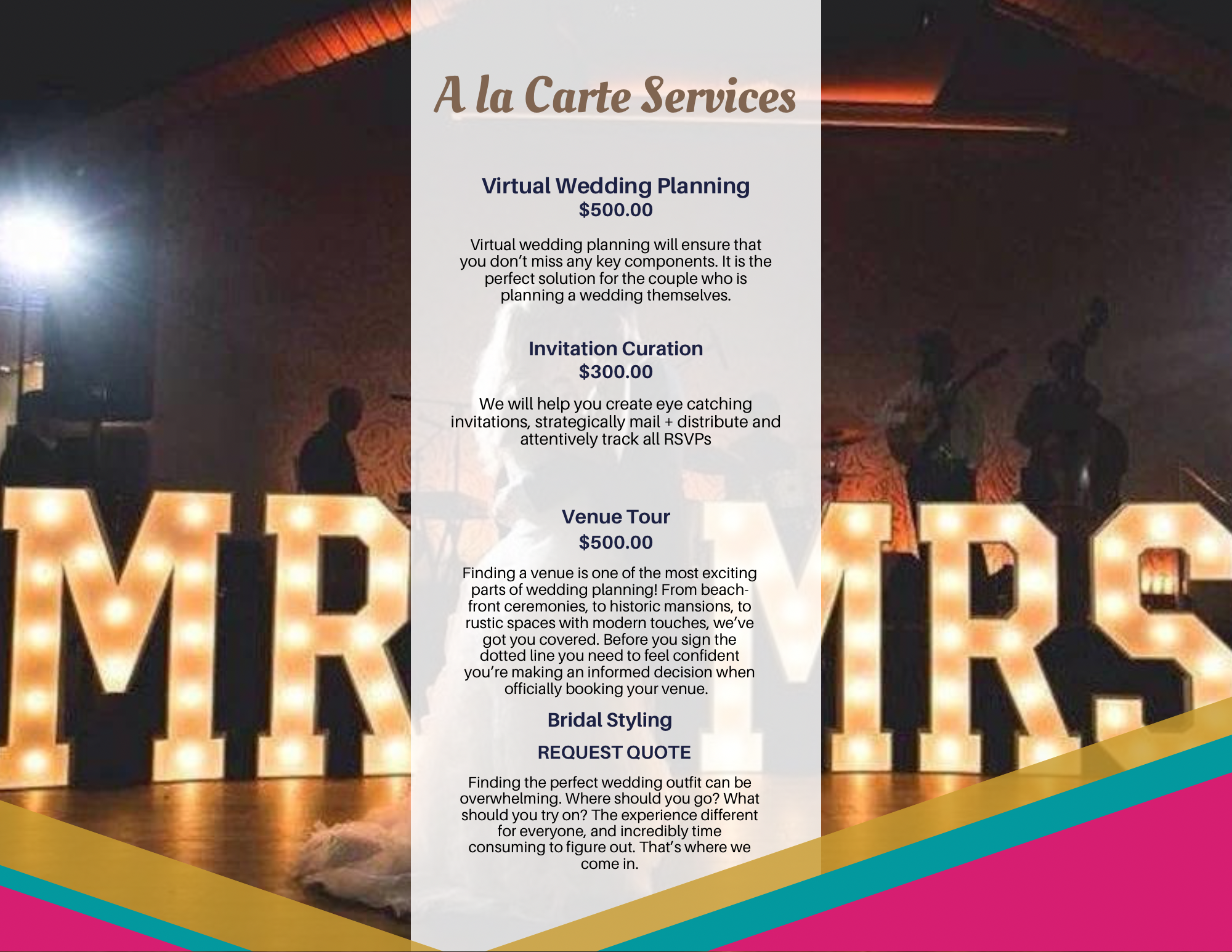 Plan Your Day, Your Way! Our A la carte services are perfect for the couple who want to create their own wedding planning package that matches their budget and wedding planning needs. book a consultation