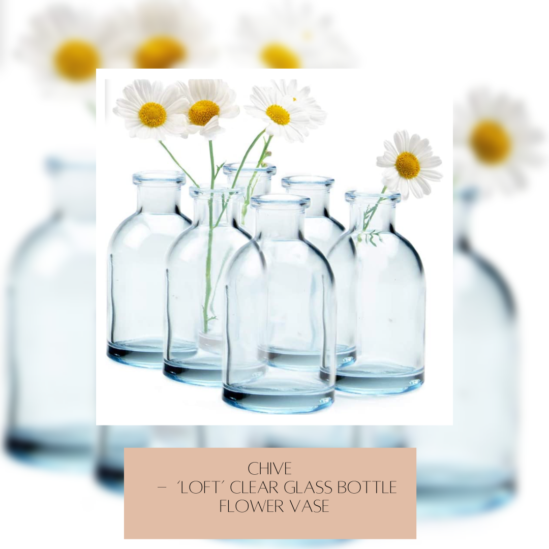 Chive ‘Loft’ Clear Glass Bottle Flower Vase — Beautiful Small Bud Vases for Flowers & House Plants — Perfect as Rustic Wedding Centerpieces or Home Decor — Tall Blue Bottle, Set of 10