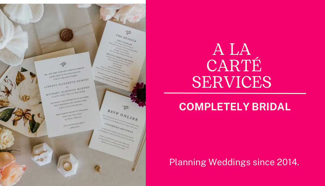 Connect with our professional wedding team to ensure you have a stress-free wedding planning experience and sophisticated wedding day. The Completely Bridal team is dedicated to helping you stay organized, check off your wedding planning checklist and most importantly get task done. Consult with one of our concierge members today for free!